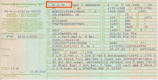 Wählen Sie das Datum der Erstzulassung Ihres Fahrzeugs. Wir haben angegeben, wo dies in Ihrem Nummernschild in der Abbildung unten zu finden.